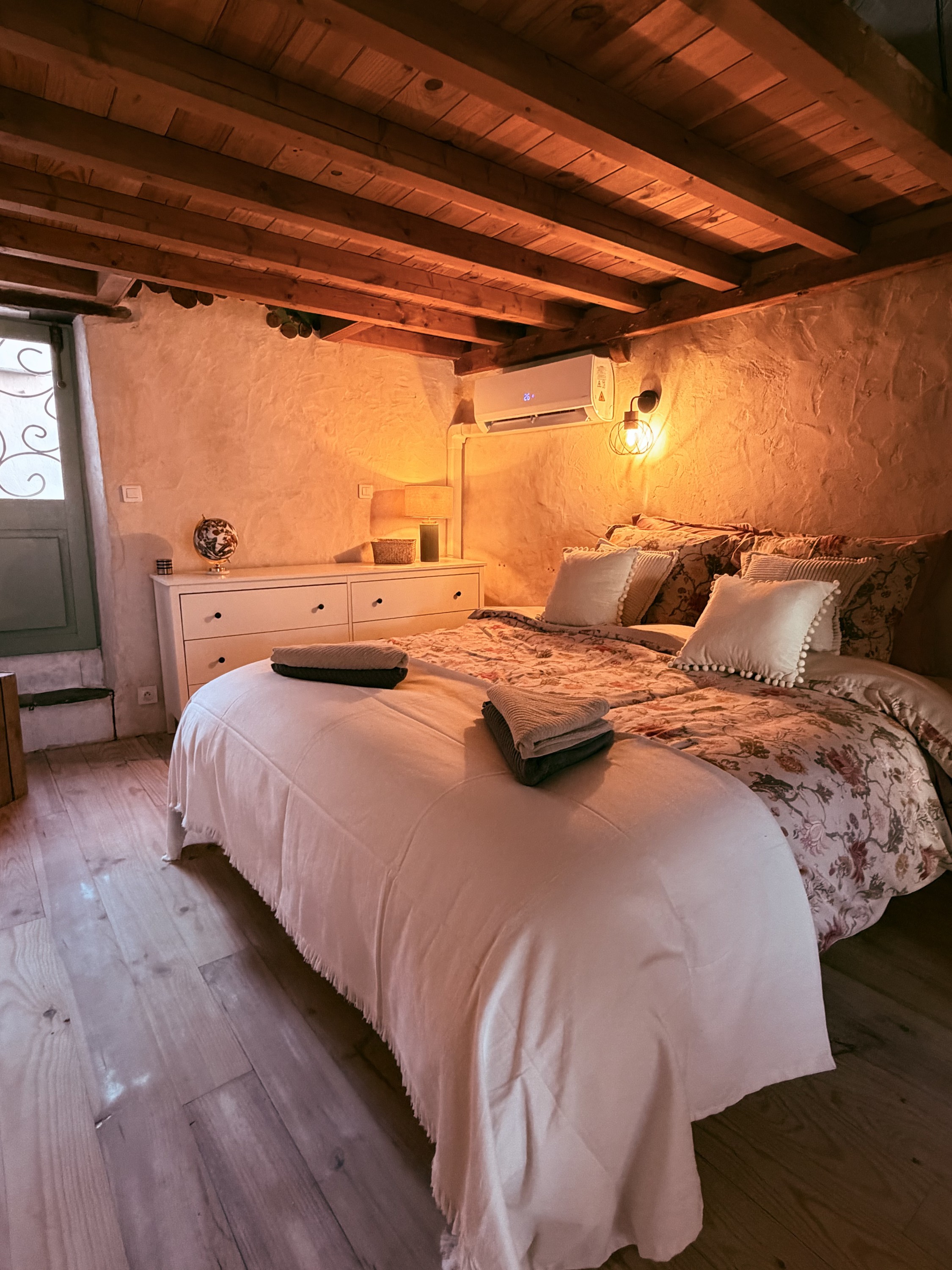 La chambre à coucher avec son lit confortable (180x200) et son éclairage tamisé créent une atmosphère propice à la détente.